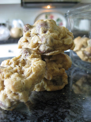 Scoop out rounded table spoons of batter onto and ungreased baking sheet. (Note: I used stonewear baking sheets, but metal ones would work fine too) Bake for about 10 minutes until the tops are just browning. They should still be slightly squishy if you want your cookies to remain chewy.