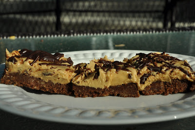The bars themselves are quite simple. They have a no-bake crust made of crushed cookies, cocoa, sugar, and butter, which is slathered with a peanut butter icing. To top it off, melted chocolate is drizzled on top for a nice crisscrossed (or should I say starcrossed) effect.