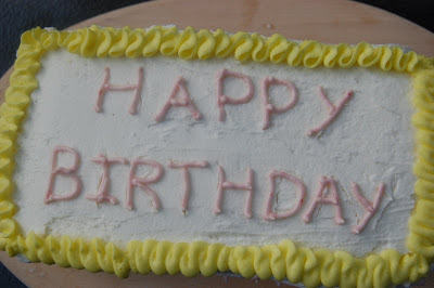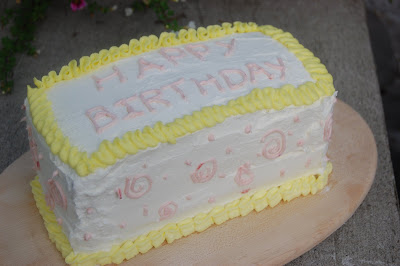 That being said, there was plenty of cake to go around and I sliced the slab of cake in thirds and stacked them on top of each other. That, combined with the great buttercream icing recipe I borrowed from The Repressed Pastry Chef (great blog, check it out!), is one heck of a cake! The one thing I will say about the buttercream is that it used Crisco as well as butter. I’m not sure if I’m a huge fan of the shortening taste in my icing. It makes it taste more like a “commercial” cake. Still, it was delicious and I managed to slather practically a whole recipe of her icing onto my cake.