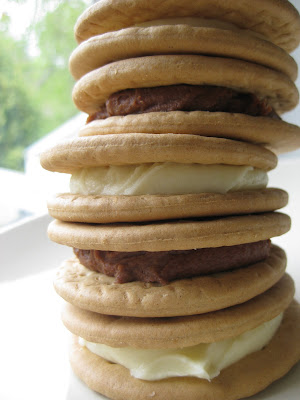 And now for the food part of this post. As you saw, I baked that wonderfully, oozy, gooey chocolate cake on the weekend. Well, I had tons of icing left over! And trust me, I’m all for grabbing a spoon and rotting my teeth, but I had a few committee meetings to go to and I thought that it would be a great way to use up my extra icing. So, I wandered off to Tescos and picked up some 25p Tesco Value Rich Tea Biscuits. The result? A gloriously rich and sweet sandwich cookie with a crunchy biscuit that is just plain (is that the right word?) enough to take the edge off the richness of the icing.